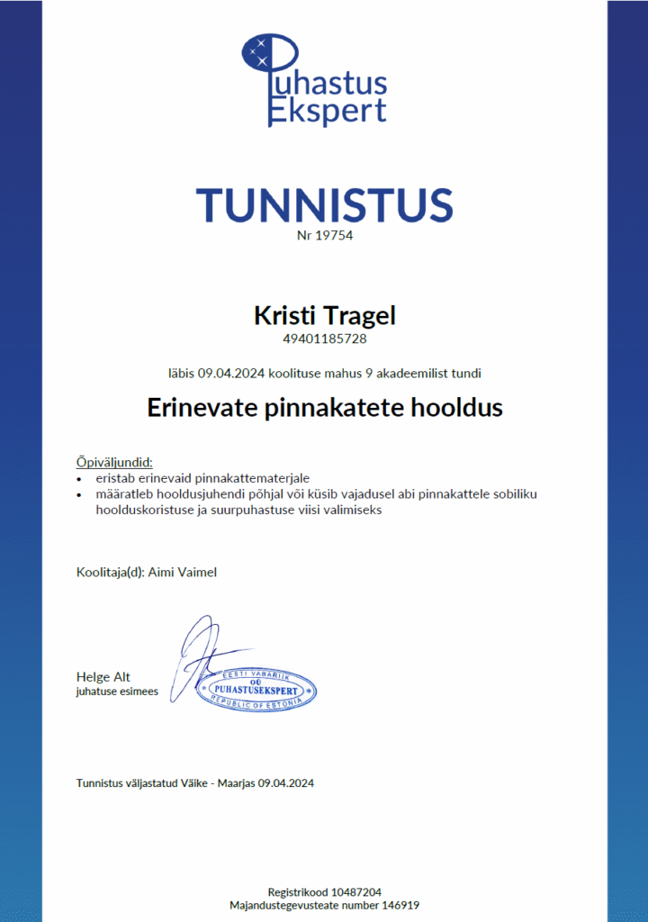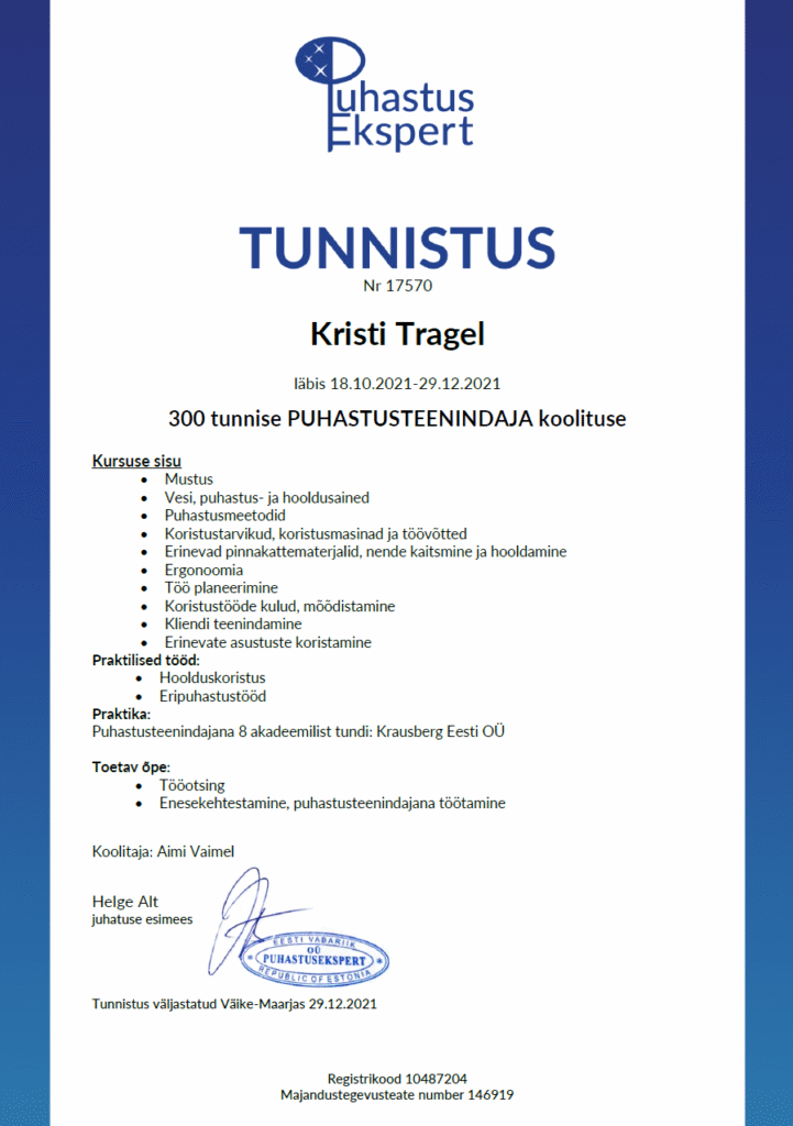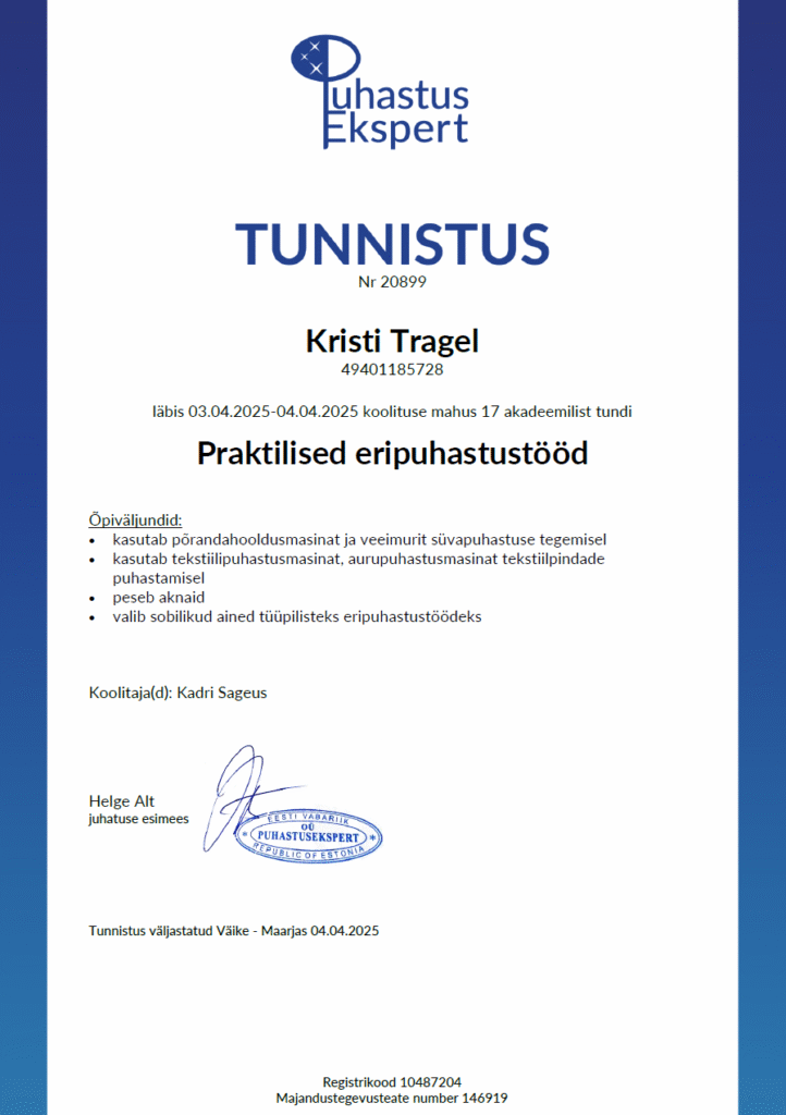 Korrastamine ja koristamine on omavahel tihedalt seotud, mistõttu täiendasin oma teadmisi ka koristusvaldkonnas. Olen omandanud puhastusteenindaja-juhendaja kutsetunnistuse.